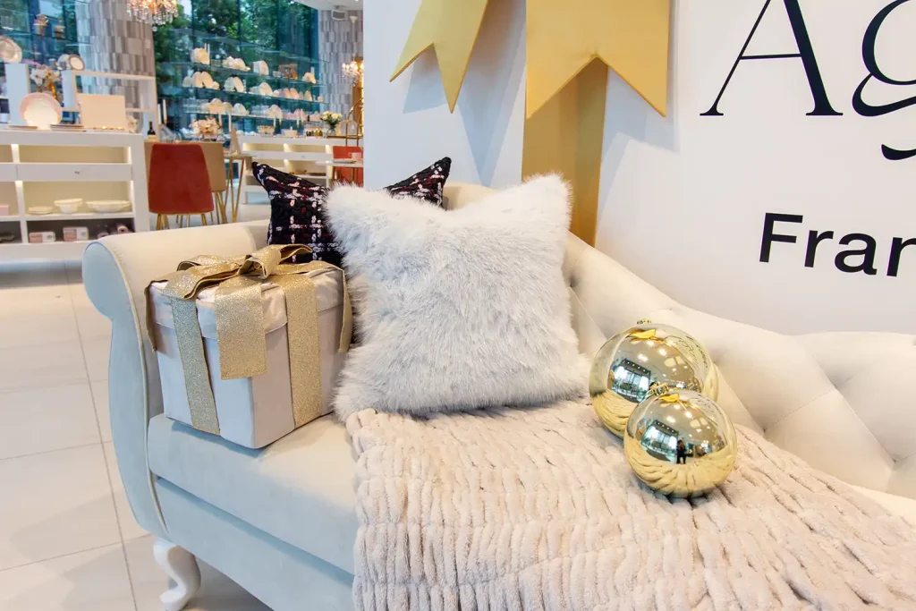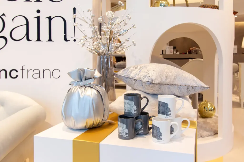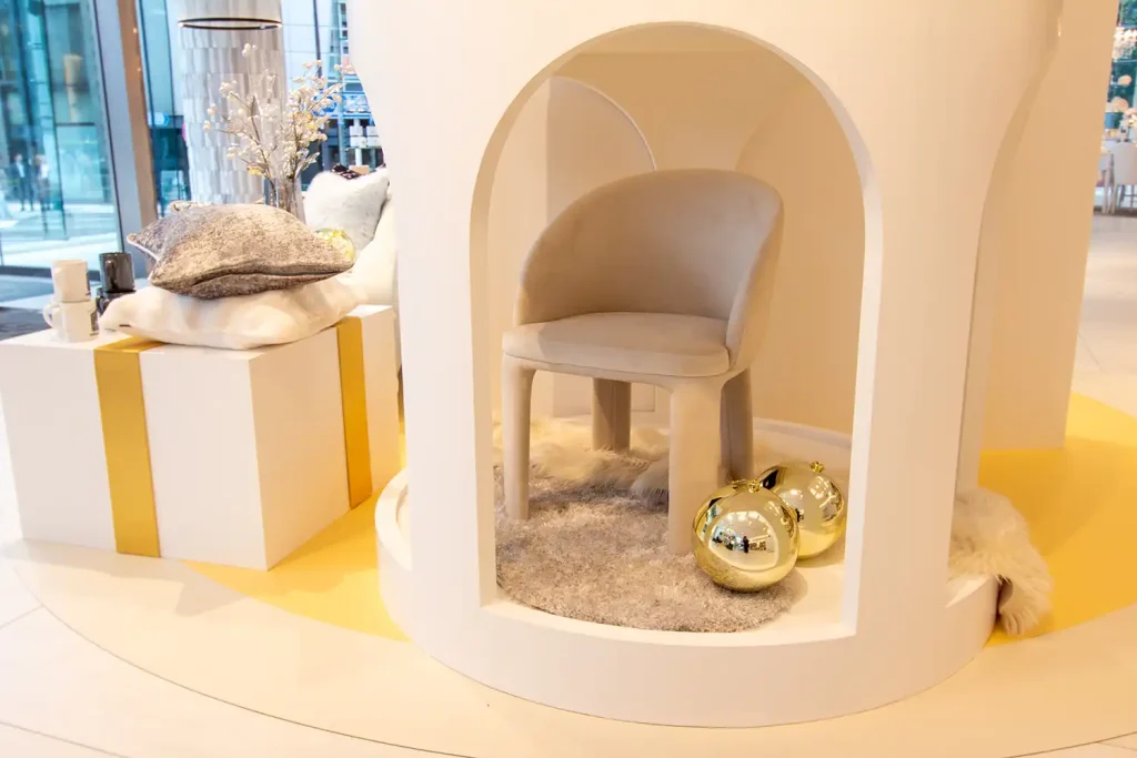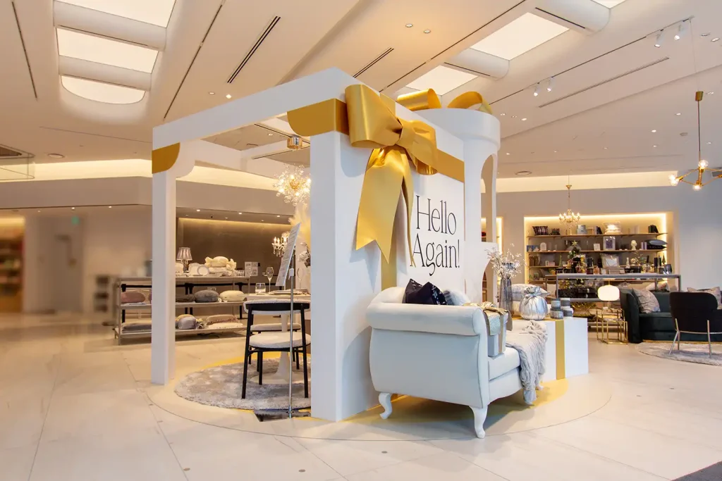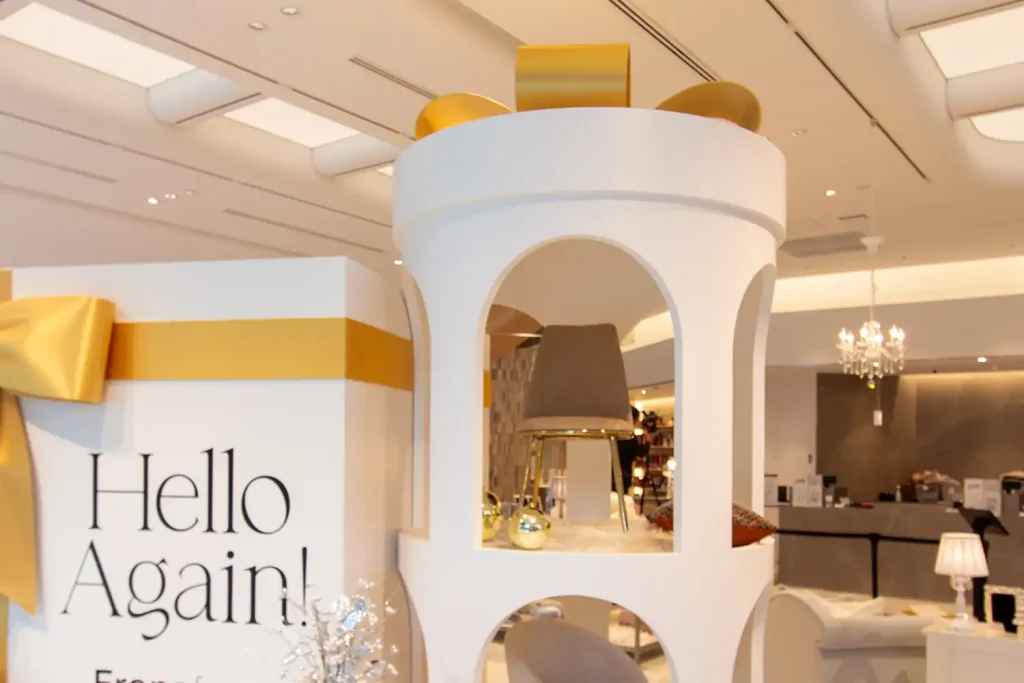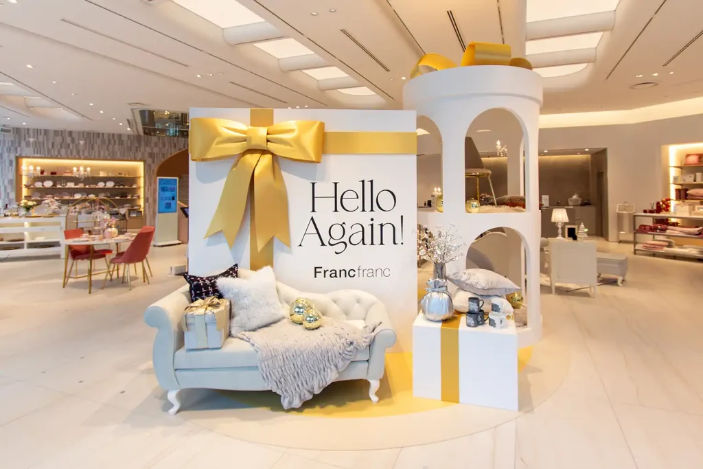 エントランスのモニュメントは、リニューアル空間を象徴する存在として来店者を迎え入れ、店舗の世界観を印象づける役割を果たしています。プレゼントボックスのモチーフと内部のインテリア展示が調和し、Francfrancが提案する“インテリアの楽しさ”を体験として伝える場となりました。
