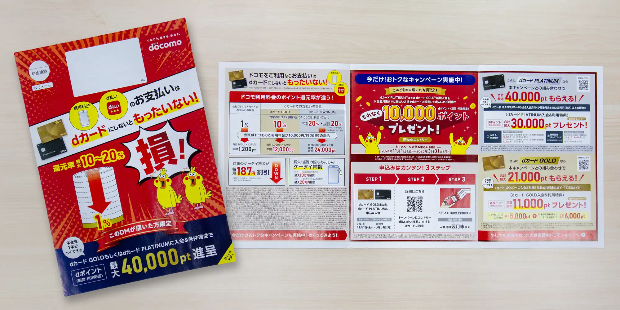 日本を代表する通信会社である株式会社NTTドコモ様。コンシューマ通信事業をはじめ、金融決済サービス、電気・ガスなどのスマートライフ事業を幅広く展開されています。ビーツは、「dカード」新規入会促進を目的としたDM施策において、企画、デザイン、制作、発送までをトータルでサポートしました。
