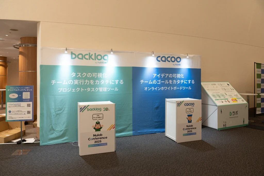 プロジェクト・タスク管理ツール「Backlog」や複数人で共同作業ができるオンラインホワイトボードツール「Cacoo」を提供する株式会社ヌーラボ様。品川インターシティホールで株式会社ヌーラボ様が主催されたカンファレンス、「Nulab conference 2025」の会場全体と各製品ブースのデザイン・設計・運営をビーツが担当いたしました。