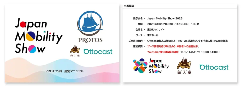 最新ガジェットの総合サプライヤー、株式会社PROTOS様。国内最大規模の自動車・モビリティ関連の総合展「Japan Mobility Show 2025」に出展され、ビーツが企画・デザインから設計・施工・スタッフ手配・運営管理までトータルサポートいたしました。