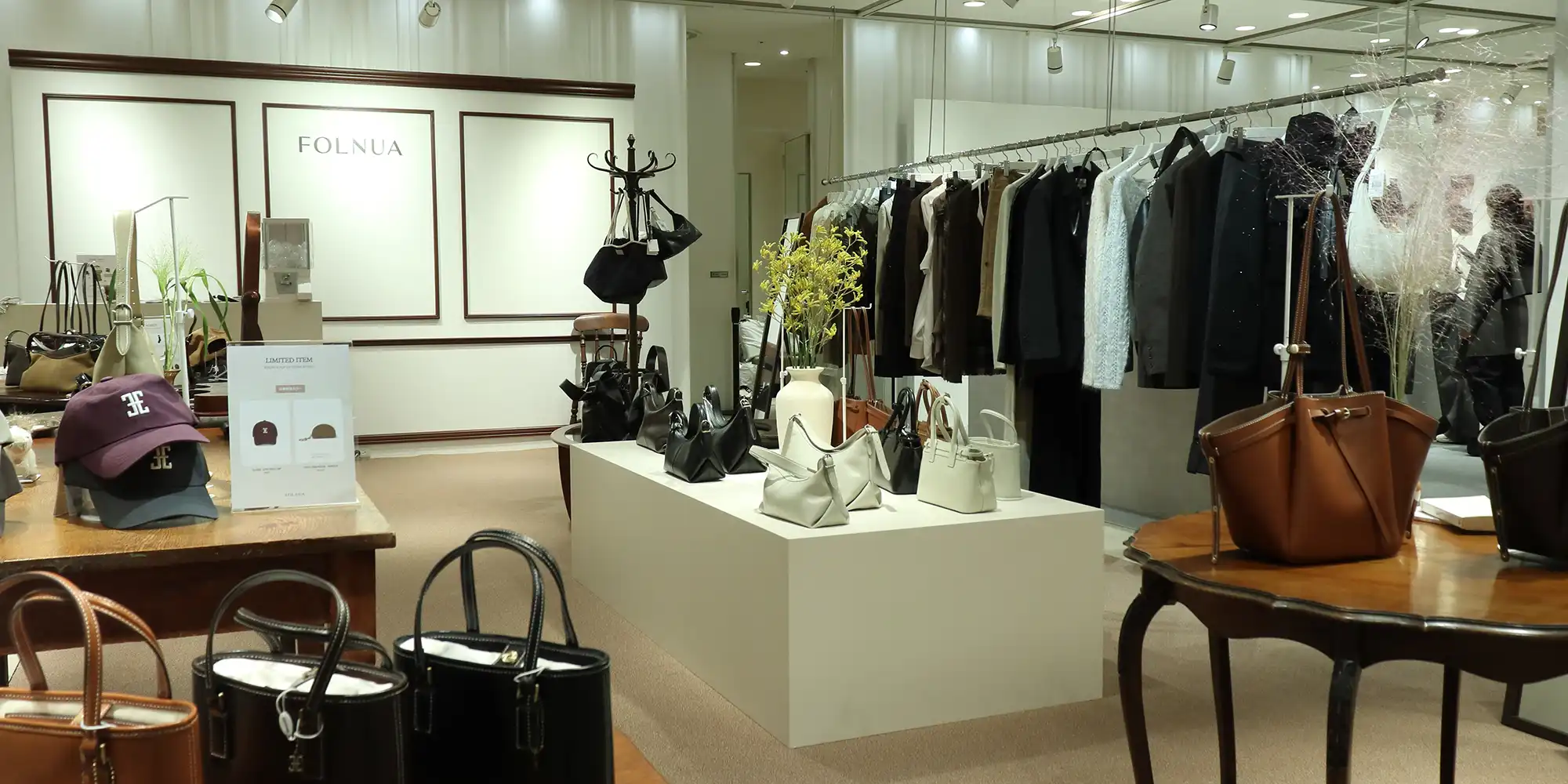 FOLNUAの韓国フラッグシップ店舗をイメージし、ヴィンテージ家具を取り入れた空間づくりを行いました。