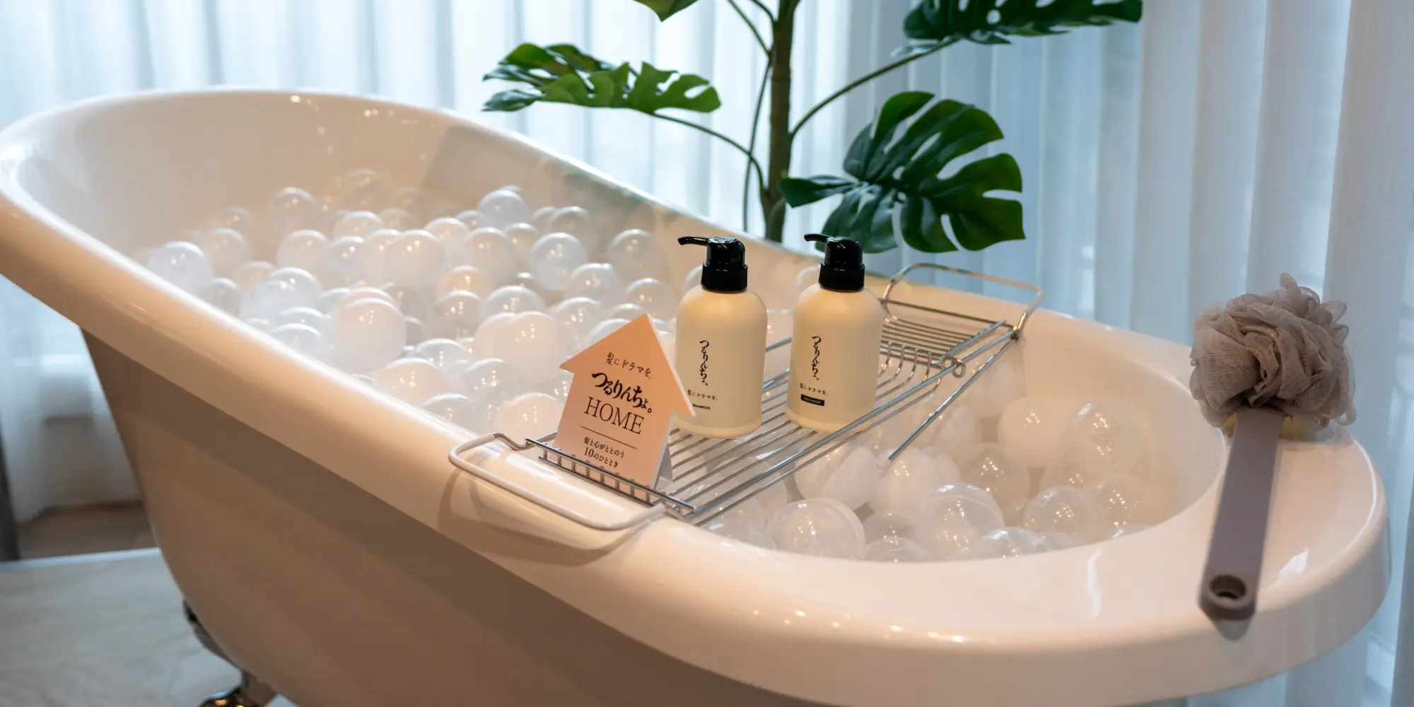 美髪のプロフェッショナルメーカーである株式会社髪にドラマを様。2025年12月に、東京・表参道にて体験型ポップアップイベント『つるりんちょ。「HOME」』を開催されました。ビーツは2025年9月に「LUCUA1100(ルクアイーレ)」で開催されたポップアップストアに続き、本ポップアップイベントの設計・施工および平面ツール制作を担当しました。