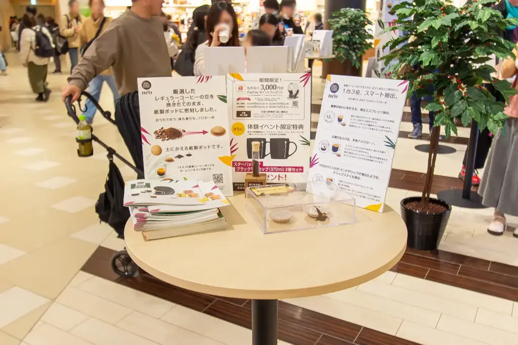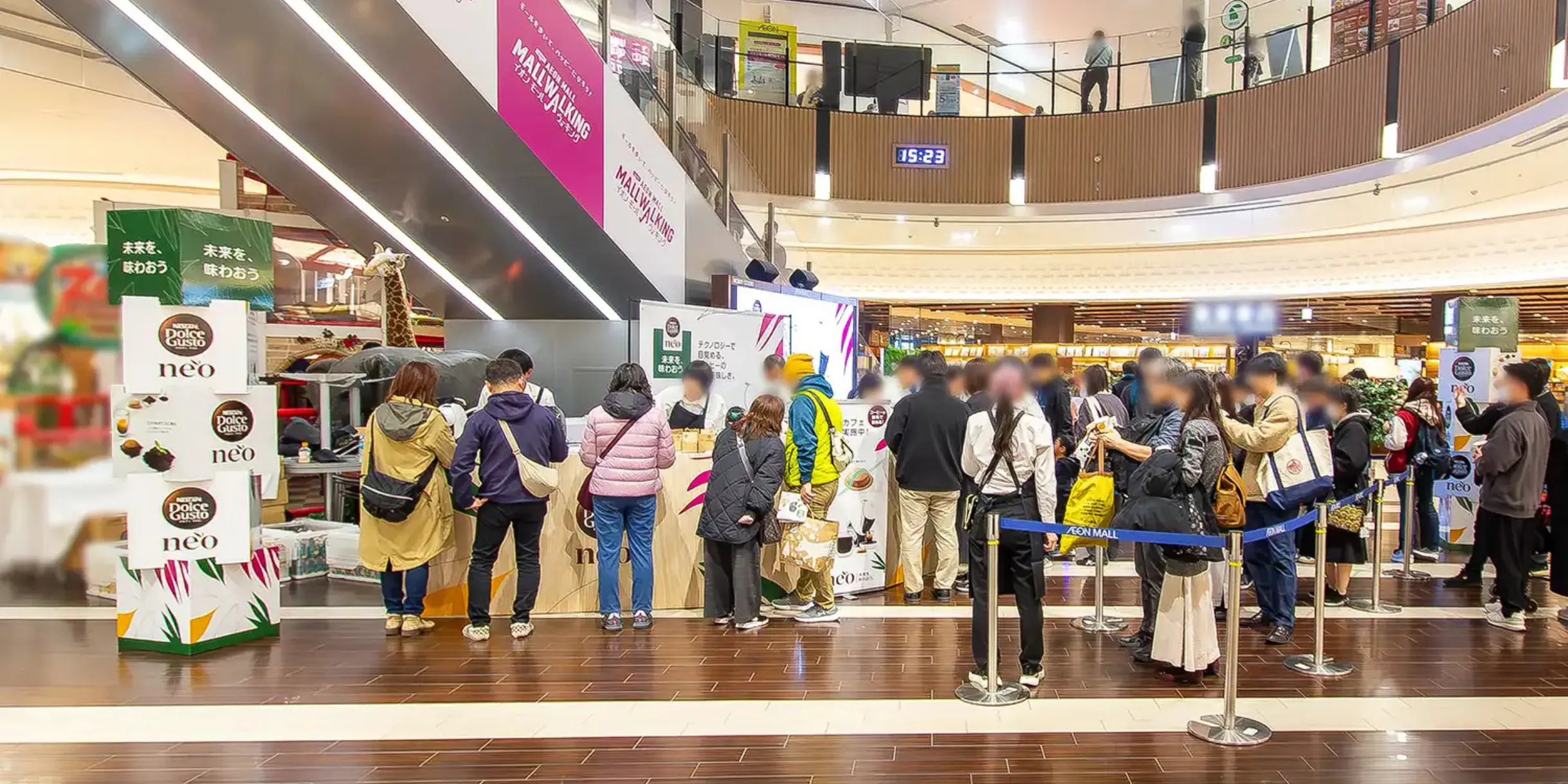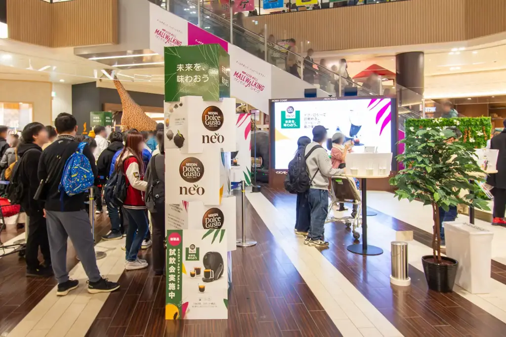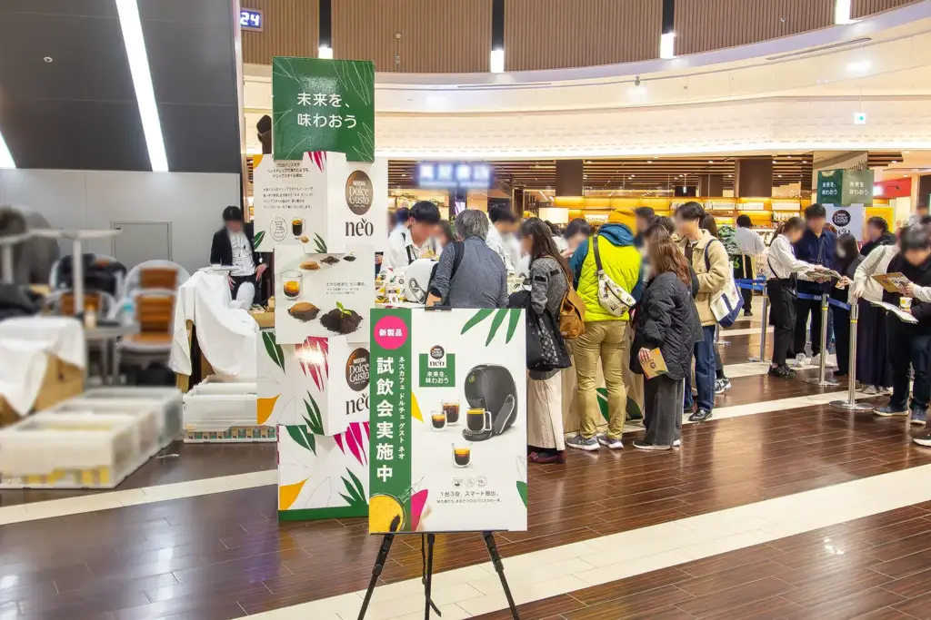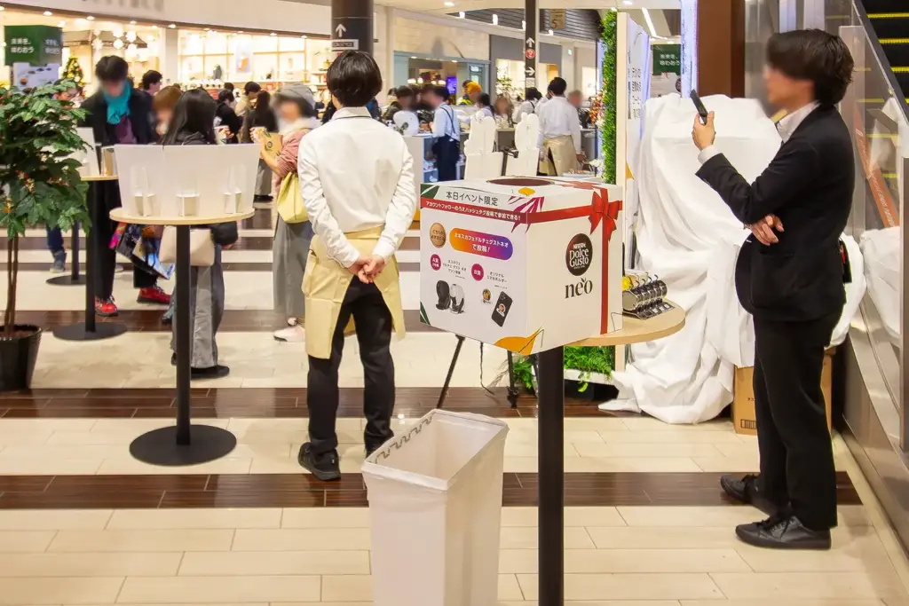 「ドルチェ グスト ネオ」発売後、試飲体験を通じて認知を広げ、新規ユーザーを獲得し、ブランド価値を高めることを目的に、全国の商業施設でプロモーションイベントが展開されました。短時間の接点でも製品の良さが伝わる試飲体験の設計が求められていました。