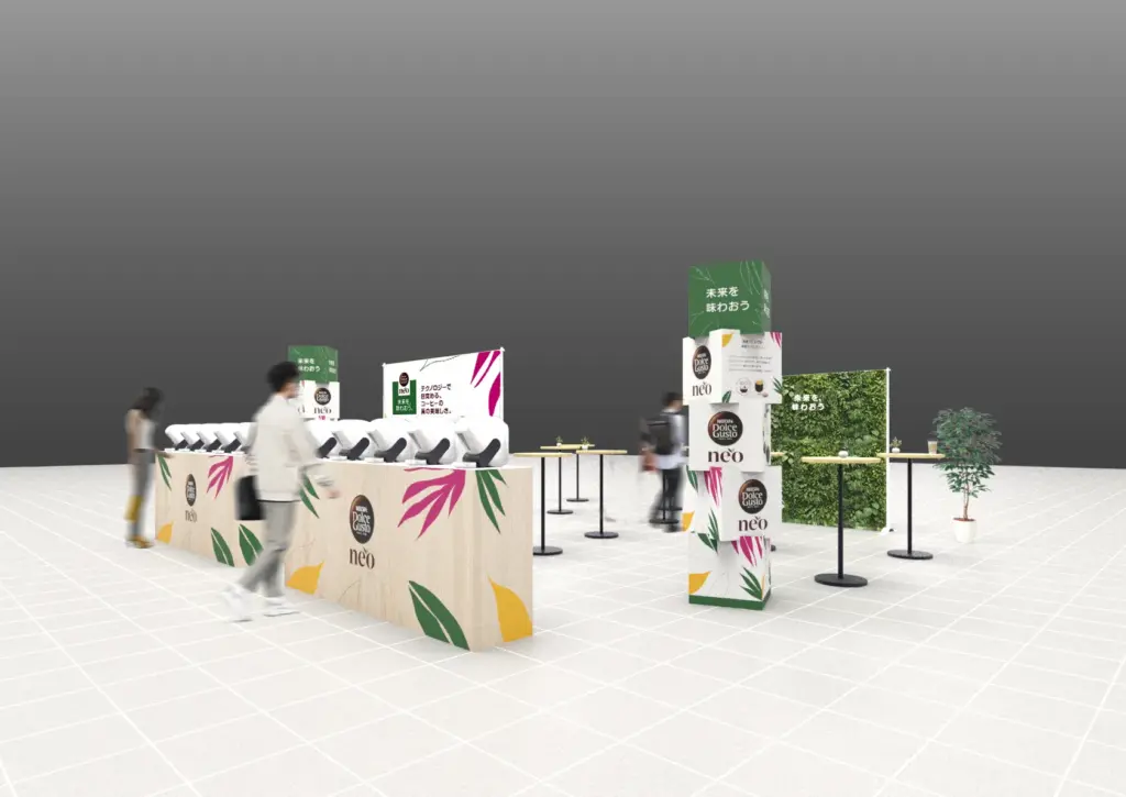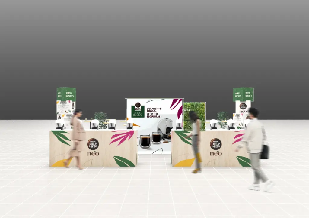 スイスに本社を置く世界最大の総合食品飲料企業ネスレの日本法人であるネスレ日本株式会社様は、2025年9月発売の新製品「ネスカフェ ドルチェ グスト ネオ(以下、「ドルチェ グスト ネオ」)」を使用した試飲イベントを全国で展開されています。ビーツは本イベントにおいて、企画構成から空間デザイン、施工、人材運営までを一貫してサポートしました。