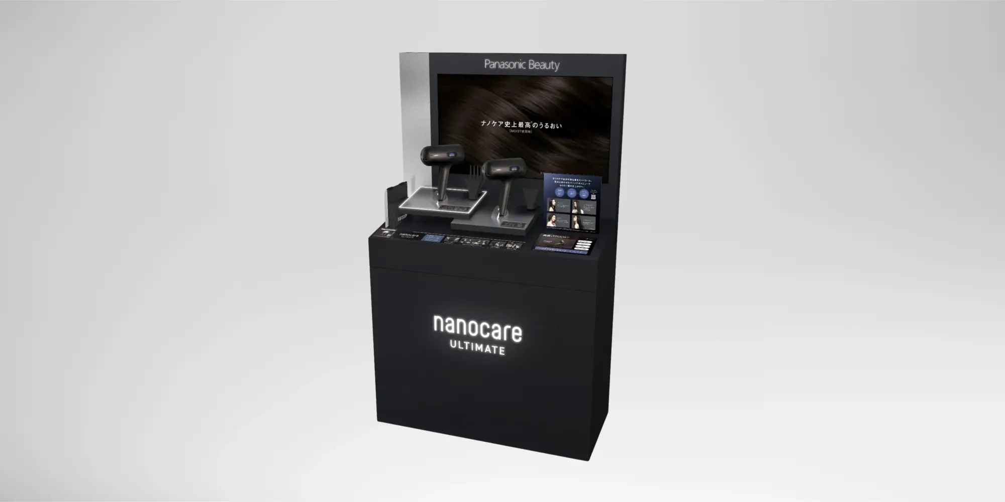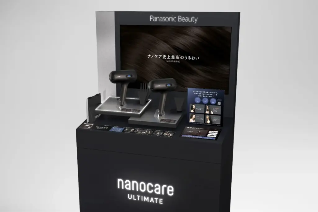 ヘアードライヤー「ナノケア」の新ライン「nanocare ULTIMATE」を展示、体験いただくための什器を製作しました。什器全体はシンプルな構成とし、ブランドを象徴するロゴをLEDで際立たせることで、新ラインの世界観を印象的に伝えています。