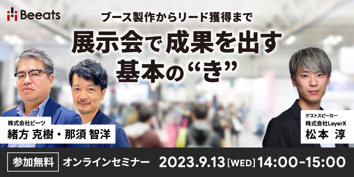| 内容 | 1)「やさしく紹介、開催前の準備」 ビーツ 目的の設定、目的の数値化、ターゲット・展示会選定、有利なブース位置、 ブース装飾の種類、コストの算出、などはじめての方にも分かりやすく事例を 踏まえてご説明します。 2)「新規顧客の獲得を目指して」LayerX 展示会出展で成果を出すための、名刺獲得〜アプローチ〜商談化について、 経験をもとにしたノウハウをご紹介します。 3)質疑応答 |