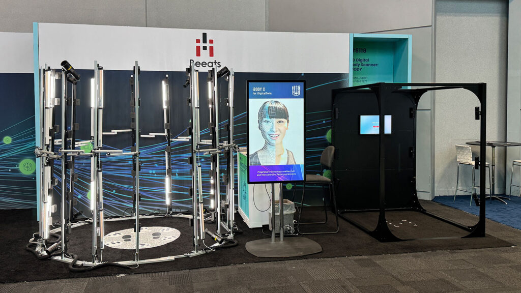 弊社ブースでは、「無人化・省力化が進む店舗のUX※を3Dボディスキャナーが創出」をテーマに掲げ、デジタルヘルスケア、デジタルツイン※領域で新たな顧客体験を創出する3Dボディスキャナー「iBODY X」「iBODY 2」の体験型展示を行いました。