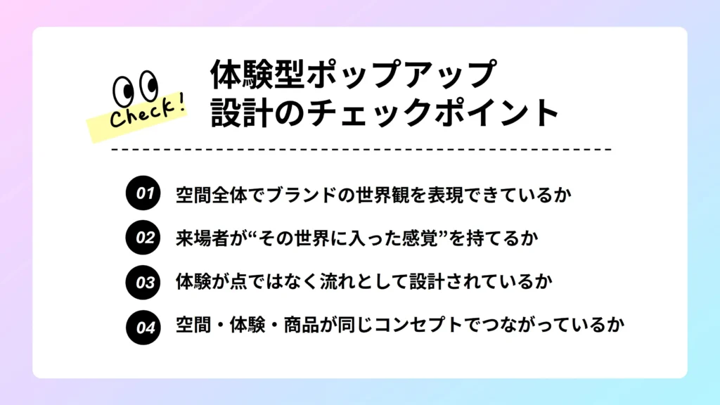 体験型ポップアップは体験をどれだけ盛り込むかではなく、空間全体がひとつの体験として設計されているかがポイントになります。