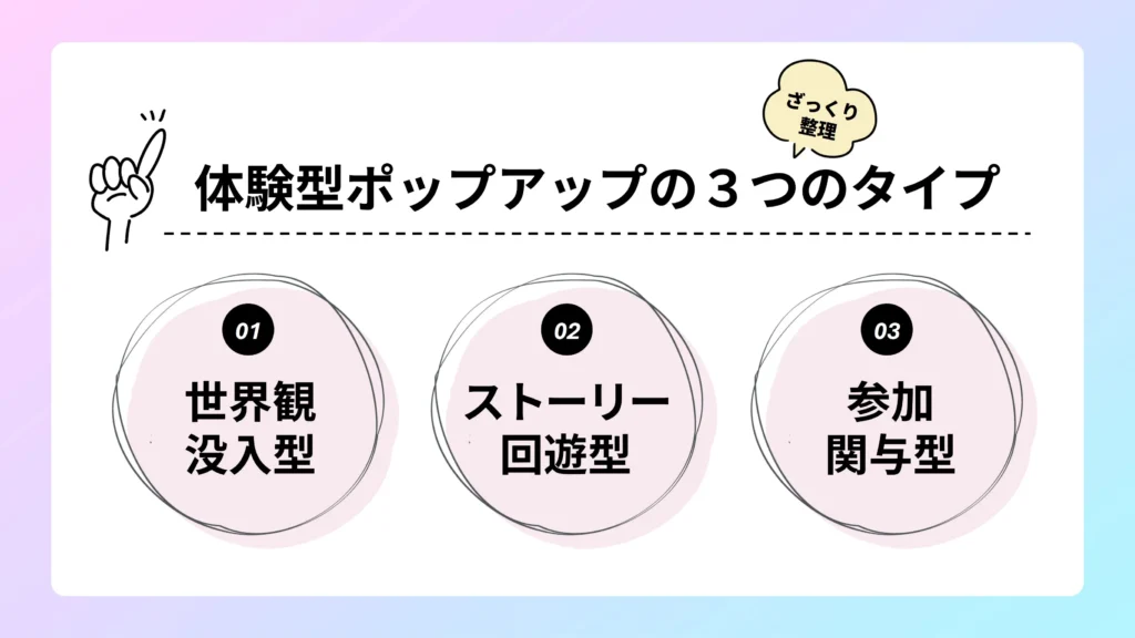 今回の3分類は、体験型ポップアップを少し整理して捉えるためのひとつの見方です。