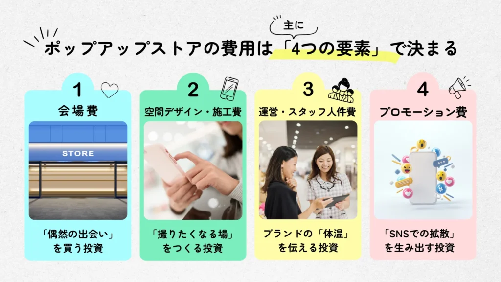 ポップアップストアの費用は、単純に「会場費+装飾費」で決まるものではありません。