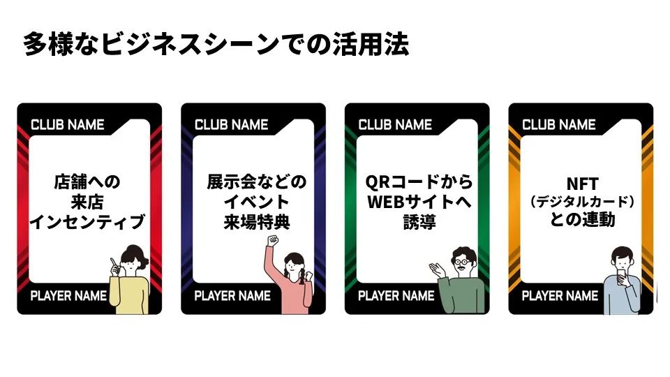 店舗への来店インセンティブとしての配布をはじめ、展示会やライブなどのイベント来場特典、カード裏面のQRコードからWEBサイトへの誘導、さらにはNFT(デジタルカード)との連動など、リアルとデジタルを横断した施策が容易に設計できます。