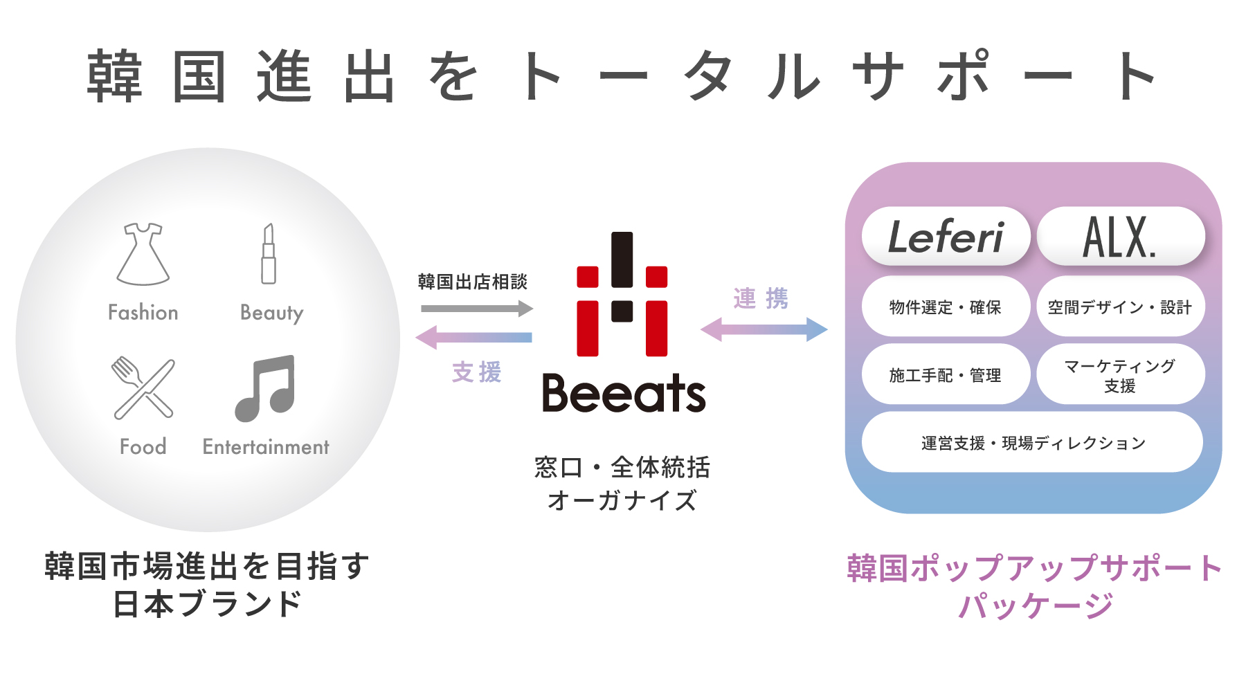 韓国最大級のビューティーMCN「Leferi」や、「AMUSE」「TIRTIR」など有名ブランドの旗艦店の空間デザイン・設計施工を手掛ける「ALX Design」と戦略的業務提携を締結。専門パートナーが、ブランドの世界観を具現化する空間づくりと集客・話題化のためのプロモーションを強力にバックアップします。