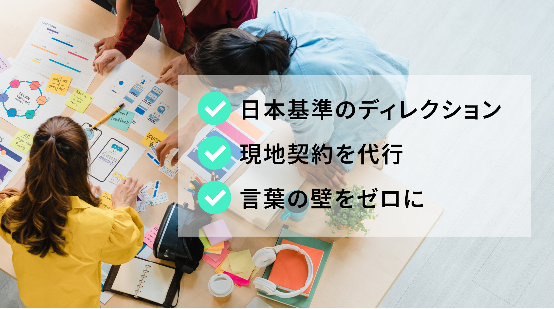ビーツのディレクターが専任窓口となり、プロジェクト全体を統合管理。現地パートナーとの複雑な交渉や、施工現場での詳細なディレクションも、すべてビーツが責任を持って監修します。お客様は日本語のみでプロジェクトを進行いただける体制を構築し、コミュニケーションロスを防ぎます。